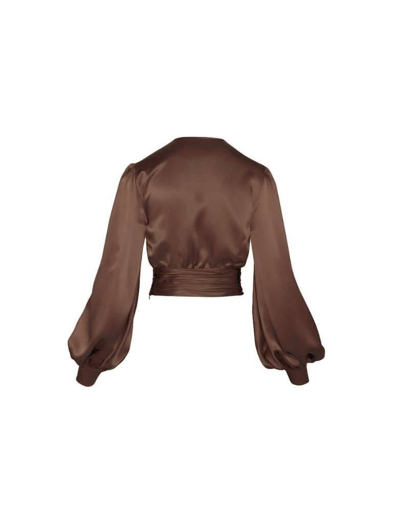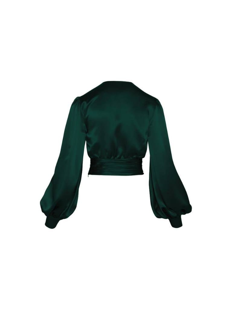 A fitted cropped satin top with balloon sleeves.