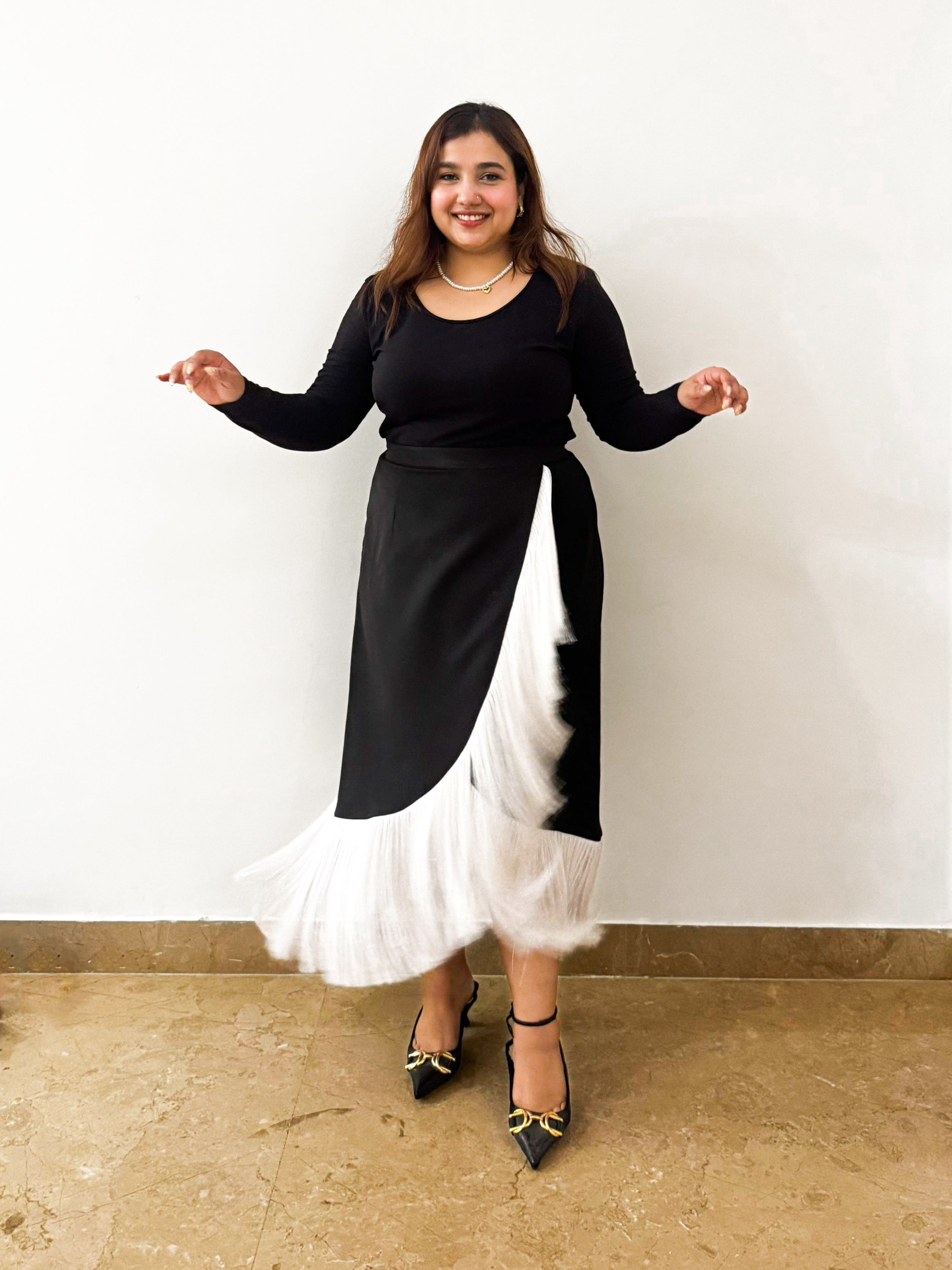A faux wrap fringed skirt with zipper on back.