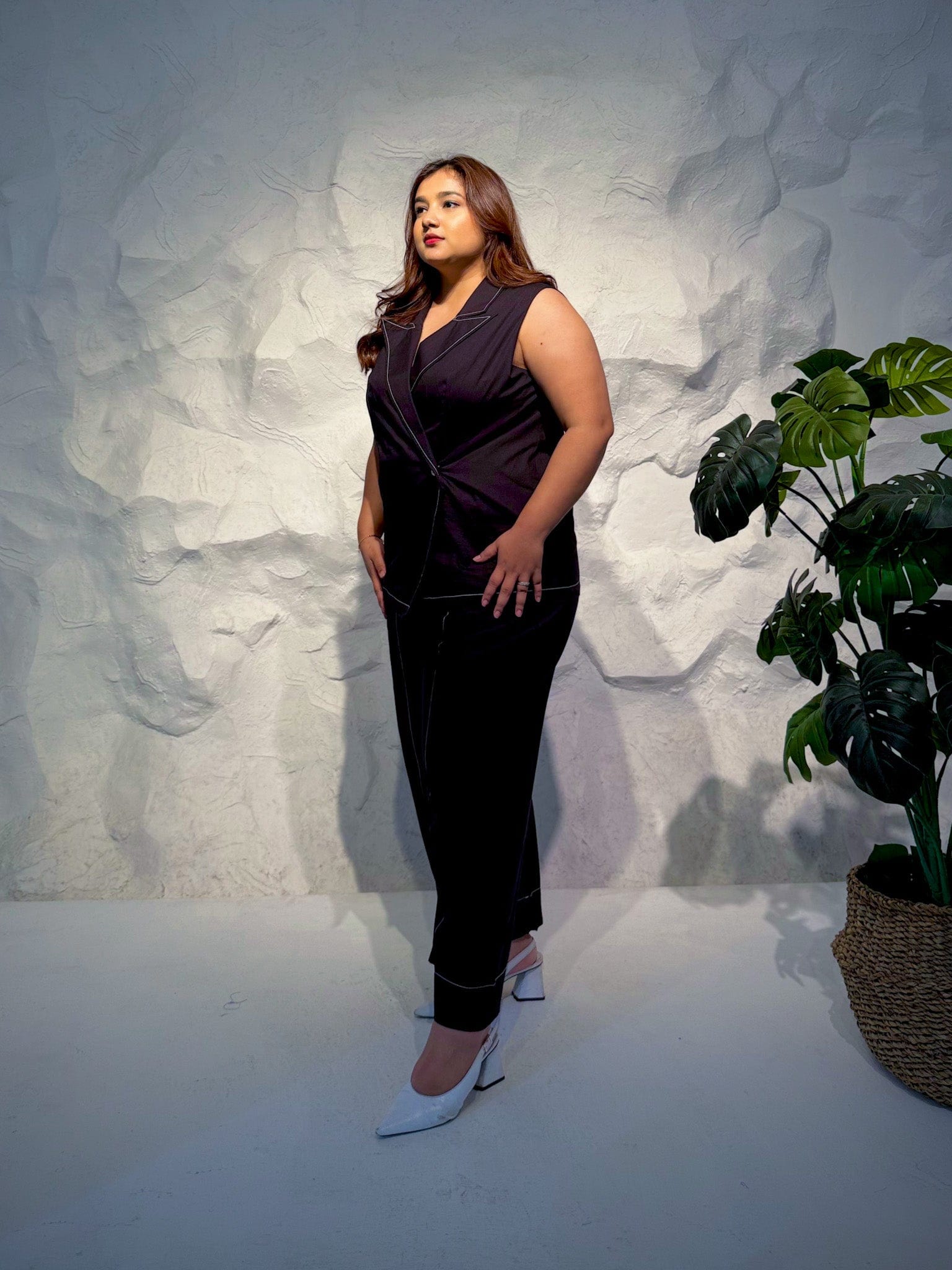 A structured boss girl co-ord set consisting a long vest-coat with two gold plated buttons in front and straight pants with contrast thread details.