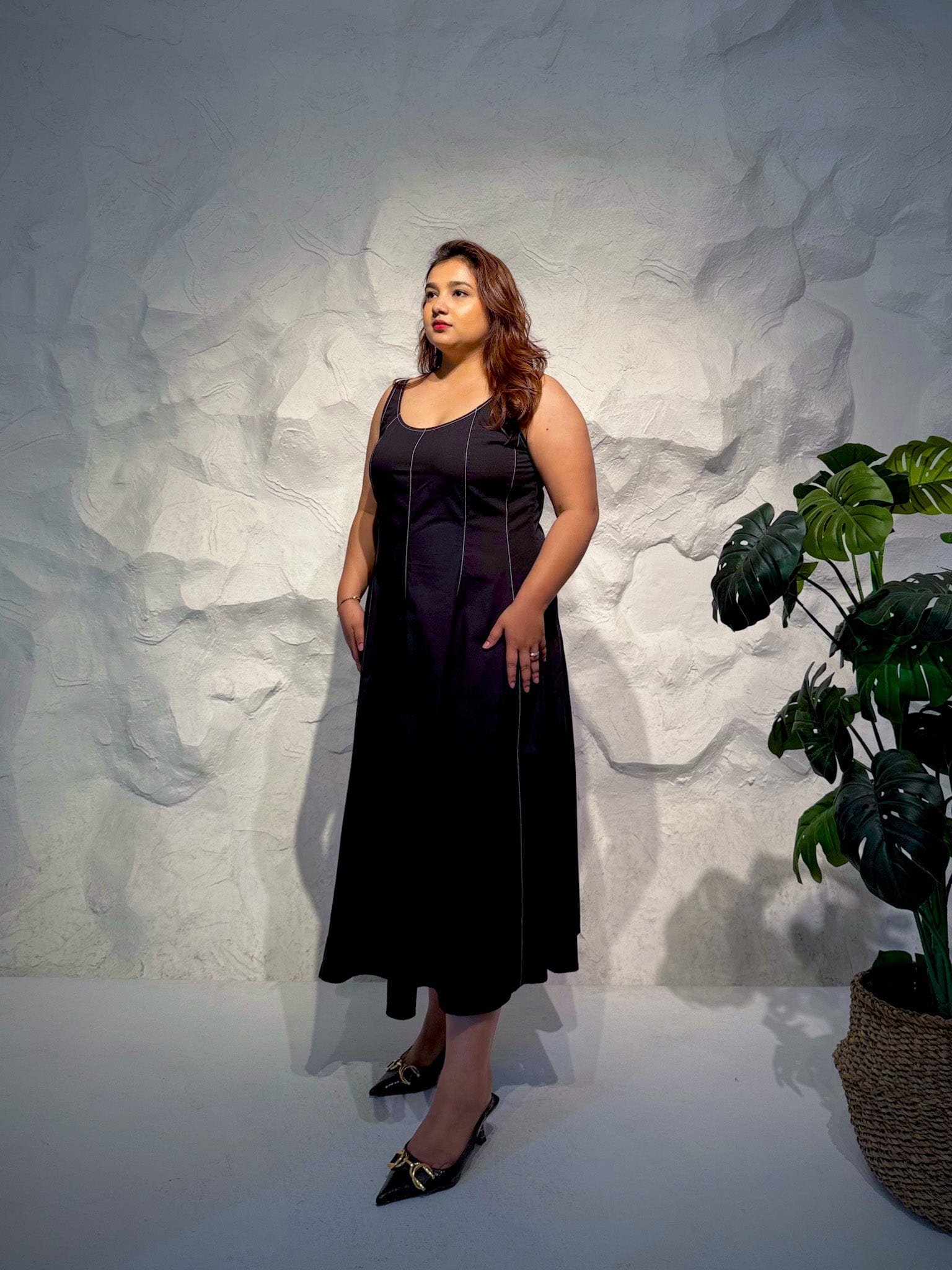 A panelled sleeveless fit and flare midi dress with thread detailing.